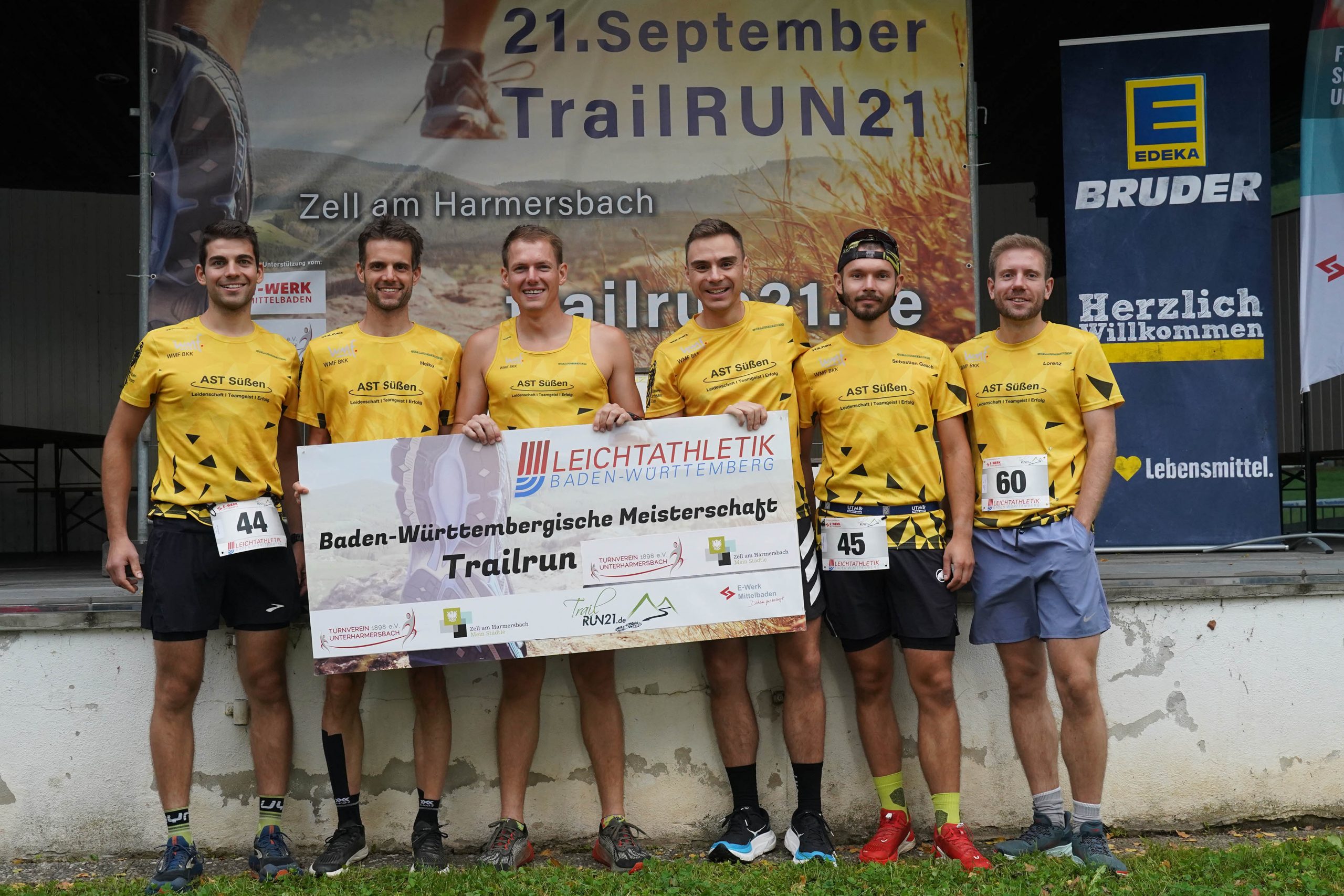 Ein langer Tag stand für unsere sechs Trailrunner am Sonntag an. Nicht, weil der Start so früh war, sondern weil die BaWü-Meisterschaften in Zell am Harmersbach eine 2,5h stündige An- bzw. Heimfahrt mit sich brachten. Die Jungs machten sich auf der Fahrt im Vereinsbus eine gute Zeit und so war die Anreise recht kurzweilig. Nach kurzem gemeinsamem Einlaufen fiel dann um 10 Uhr der Startschuss. Gut positioniert ging die blackandyellowcrew somit vorne auf die 19,6 Kilometer lange und mit knapp 600 Höhenmetern anspruchsvolle Strecke. Wie zu erwarten konnte Benedikt vorne mitmischen. Leider nur so lange bis er die Strapazen der vergangenen Wochen spürte. Glücklicherweise kam dieser Zeitpunkt relativ spät im Rennen, sodass mit Rang drei der Platz auf dem Podium noch möglich war. Zudem legte er einen guten Grundstein für das Teamergebnis. Auf Platz 13 folgte dann Nils Kugler, dem die Strecke viel zu kurz war. Das Gegenteil musste Fabian Borgia für sich feststellen, der nur schwer über die Hügel im Schwarzwald kam, mit Platz 17 allerdings dennoch weit vorne im Feld finishte.