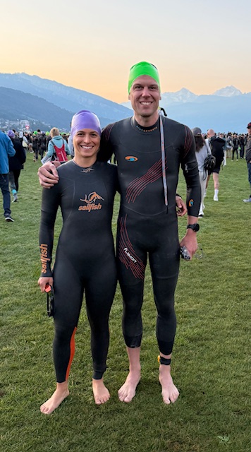 Im 17 Grad kühlen und glasklaren Thuner See ging es morgens kurz vor 7 Uhr im schönstem Bergpanorama mit Blick auf Eiger, Mönch und Jungfrau auf die 3,8km lange Schwimmstrecke. Mit den Zeiten von 1:01h und 1:19h waren beide zufrieden.