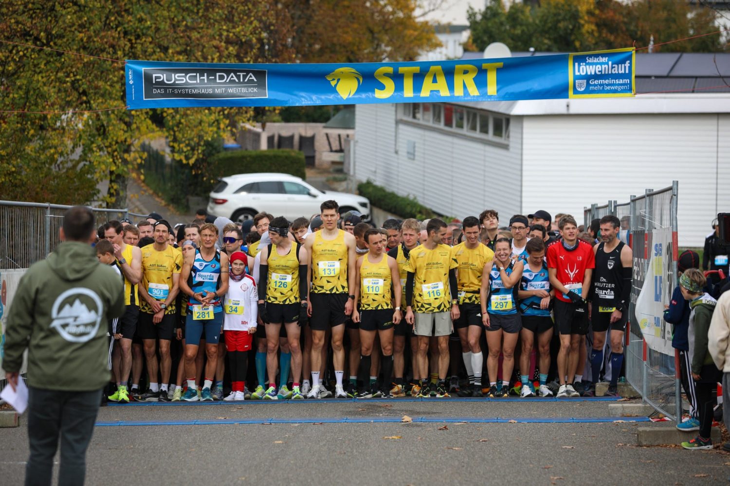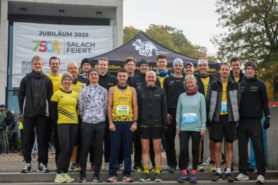 Etwas, dass es schon lange nicht mehr gab und auch sonst nur noch selten vorkommt, durfte man am vergangenen Sonntag in Salach bestaunen: Das Männerpodium beim Salacher Löwenlauf wurde komplett in Schwarz-Gelb bestiegen. Benedikt Nußbaum, Heiko Thiele und Daniel Vergote liefen auf den Plätzen 1-3 ins Ziel und sicherten sich damit auch den Mannschaftssieg. Während Benedikt und Heiko das Rennen von vorne bestimmten und sich bis ins Ziel nichts schenkten, sicherte Daniel das perfekte Ergebnis souverän auf Platz drei ab. Alle drei nahmen den Lauf als Vorbereitung für ihre anstehenden Herbsthighlights. Daher wurde der optimistisch angepeilte Streckenrekord, und das damit verbundene i-Tüpfelchen, knapp verfehlt. Benedikt, am Vortag noch siegreich über die fünf Kilometer beim Maultaschenlauf in Nattheim, hat am kommenden Wochenende den Frankfurt Marathon vor der Brust. Daniel stellt sich der Challenge Albmarathon (50 Kilometer) in Schwäbisch Gmünd und für Heiko endete am Sonntag die letzte harte Trainingswoche mit 100 Laufkilometern vor dem New York Marathon in zwei Wochen. Alle drei freuten sich über eine grandiose Teamleistung und eine gelungene Generalprobe für ihre persönlichen Highlights. Abgerundet wurde die starke Teamleistung mit den Plätzen fünf und sechs durch Rouven Emmerich und Crewdebütant Stefan Keifer, welcher sich zusätzlich mit dem Titel als schnellster Salacher feiern durfte.