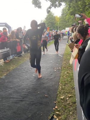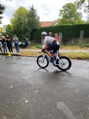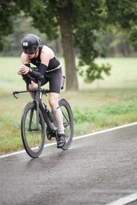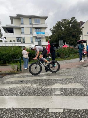 Der erfahrenste auf der Mitteldistanz war an diesem Tag André, obwohl er erst seit rund zwei Jahren Triathlon macht und erst seit diesem Jahr Mitglied im AST ist. Da er dieses Jahr bereits schlechte Erfahrungen mit dem Regen bei seiner olympischen Distanz in Tübingen gehabt hatte, war seine Stimmung vor dem Start nicht die Beste. So waren seine Gedanken mehr auf der nassen Radstrecke als auf das Rennen fokussiert. Dennoch ging er seinen Tag mit der notwendigen Konsequenz und Konzentration an, konnte in T1 noch wichtige Änderungen am Rad vornehmen und begab sich zum Schwimmstart. Die erste Disziplin beendete er mit einer soliden Zeit. Nun ab aufs Rad und die nassen Straßen Brandenburgs. Wie mehrere andere Athleten an diesem Tag blieb auch André leider nicht von einem Sturz verschont, konnte aber nach kurzer Behandlung weitermachen. Ein Dank gilt hier den Streckenposten, welche unseren Athleten gleich versorgt und wieder rennfähig gemacht haben. Durch die Abschürfungen am Ellbogen wurde die Aero-Position auf dem Zeitfahrrad von nun an eher ein Nach- anstatt Vorteil. Mit großem Kampfgeist ging es dann zum Laufen, wo er sich selbst nochmals überraschen konnte. Auch wenn die letzten Kilometer etwas langsamer wurden finishte er mit seiner schnellsten Halbmarathon Zeit in diesem Jahr und war sehr glücklich das Ziel an diesem Tag erreicht zu haben. Seine Splits: 37:25min/ 2:44:18h/ 1:46:22h für eine Gesamtzeit von 5:19:26h. Damit 114 Platz in seiner AK und 628. im Gesamtfeld.